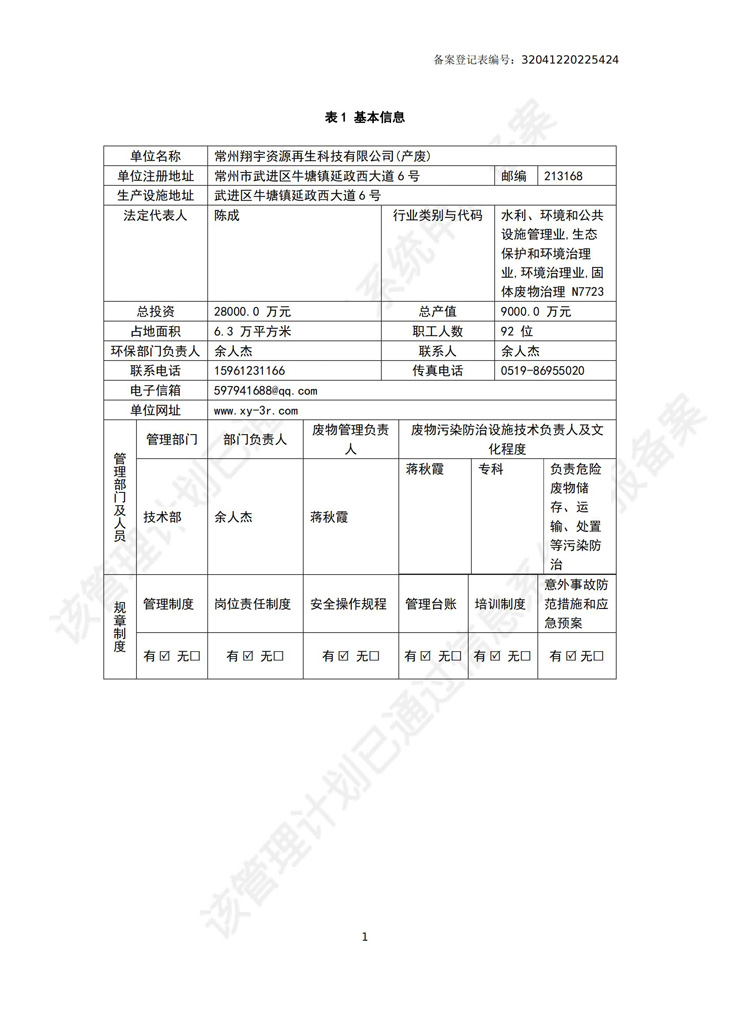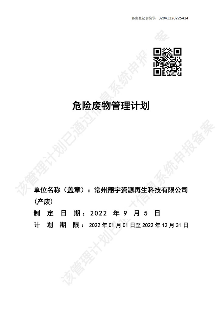 常州翔宇资源再生科技有限公司2022年危险废物管理计划及污染环境防治信息